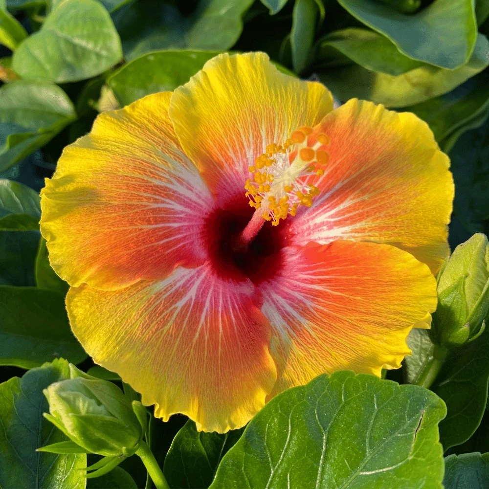 Gorgeous pinks, oranges and yellow dance all over the Cosmic Dancer Cajun Hibiscus blooms. This variety is a heavy bloomer. Pinching will encourage heavy branching and deadheading will ensure bloom upon bloom upon bloom. Producing exquisitely-colored blossoms that start with a well-defined, pinwheel-shaped, mahogany-colored center surrounded by outwardly flowing colors of pink, orange and yellow. These gorgeous flowers grow well in containers or as a beautiful accent in landscape. In northern climates Cajun hibiscus are grown as house plants or annuals. In southern climates these sun loving plants can even be planted close together to form a unique hedge or living privacy wall. These tropical plants thrive in full sun locations. Plants need to be kept well watered, especially in the heat of the summer.
