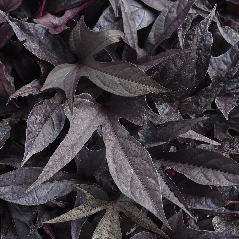 Sweet Caroline⢠Raven Ipomoea Plants by Proven Winners® offer leaves with only 3-lobes, but uses that design to perfection! Its gently curvaceous nature with soft, rounded tips makes for an elegant presentation, especially when combined with the purply-black coloration and heavy venation. The stems are a lighter violet, adding very pretty contrast. Try pairing this wonderful purple Sweet Potato Vine with white or yellow annuals!